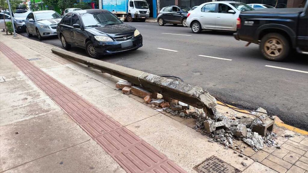 Poste derrubado por carro na Rua 13 de Maio segue danificado e no meio da calçada